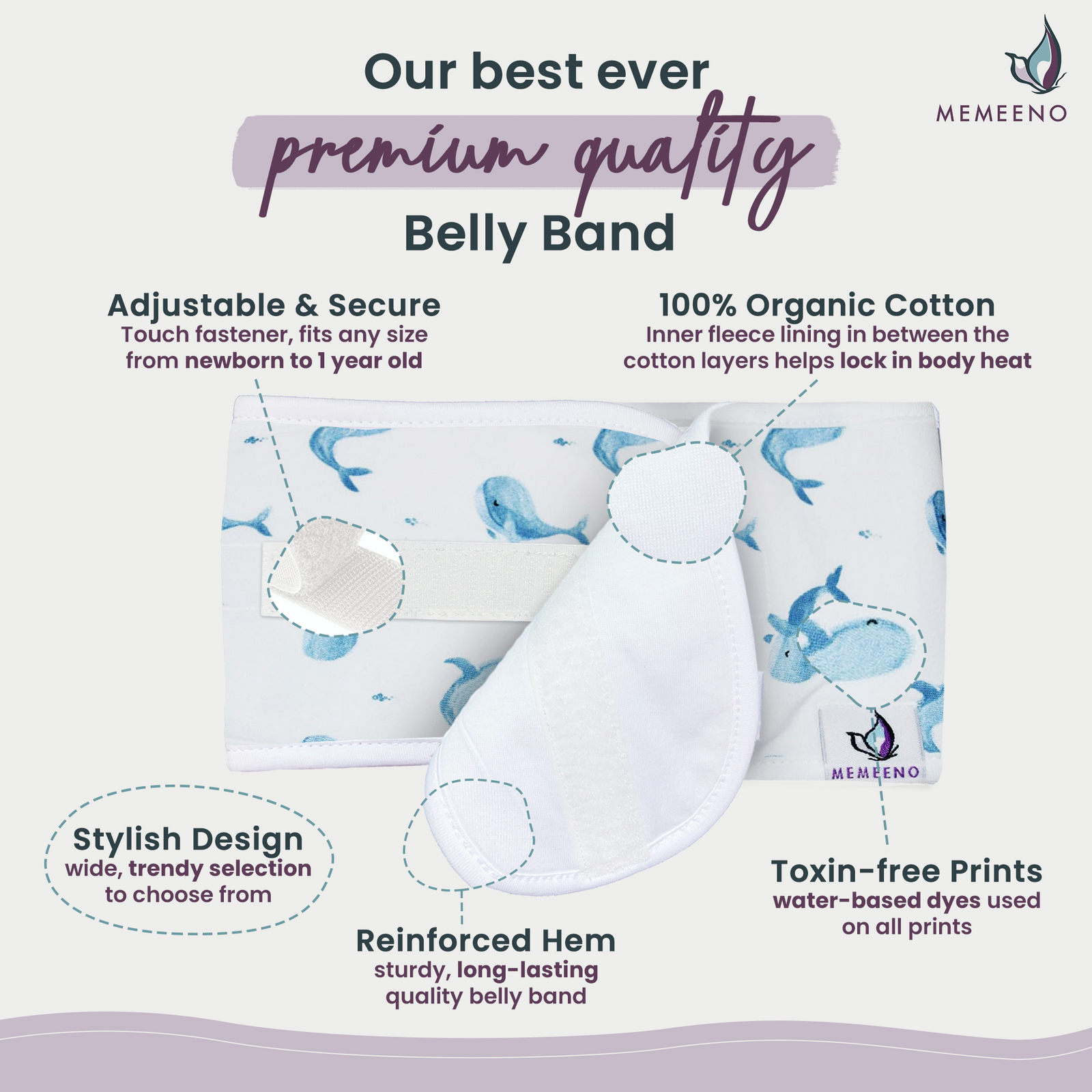 The MEMEENO belly band is a baby accessory used to warm and soothe the belly.