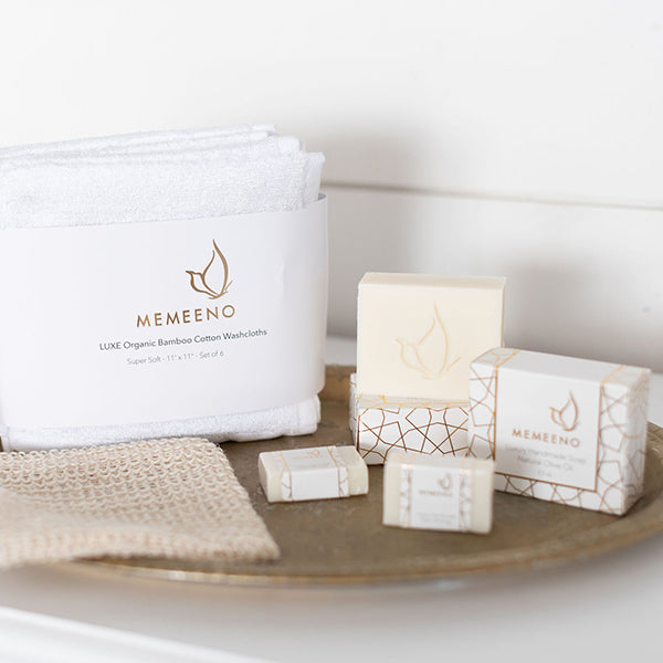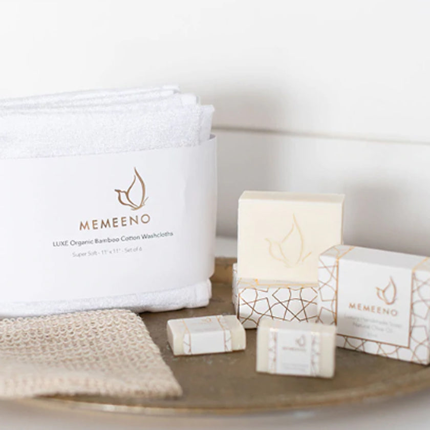 Enjoy the luxury of spa life right in your own home with carefully curated bath items that the whole family can indulge. Handmade and fragrance-free all-natural olive oil soap, baby massage oil, organic bamboo washcloths, sisal cotton soap pouch to save your soap or use as a washcloth with an added exfoliator.